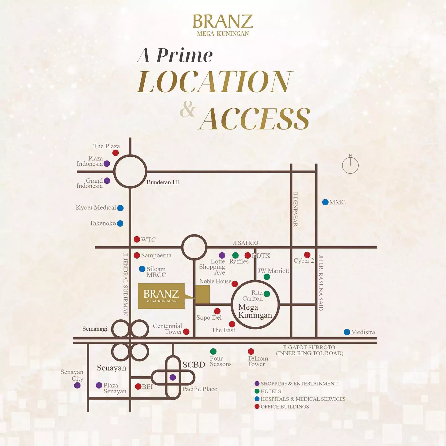 Terletak di lokasi bisnis Jakarta Branz Mega Kuningan sangat mudah di jangkau dari manapun, di sekeliling apartment mayoritas adalah Gedung-gedung perkantoran.